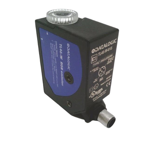 Capteur de contraste de base Datalogic TL46-W-815 avec spot vertical, sortie PNP/NPN, connecteur M12 à 5 pôles, idéal pour la détection de marques.