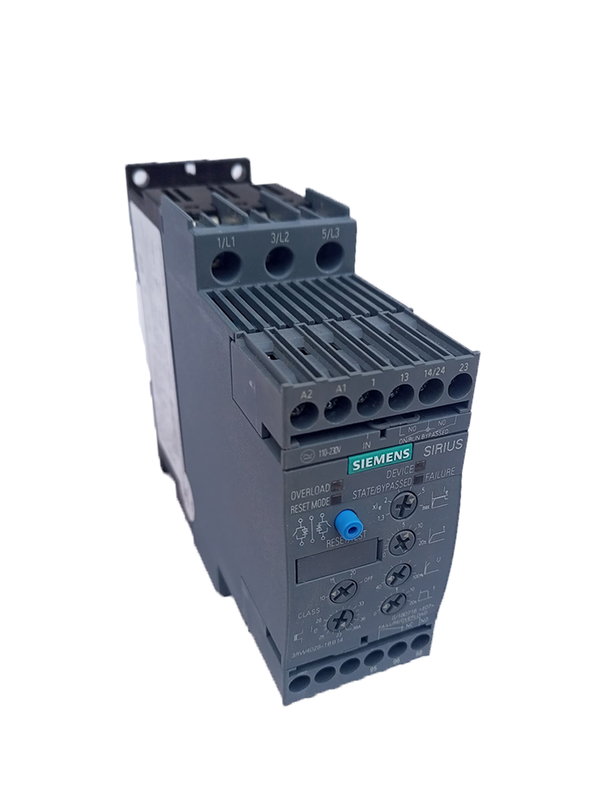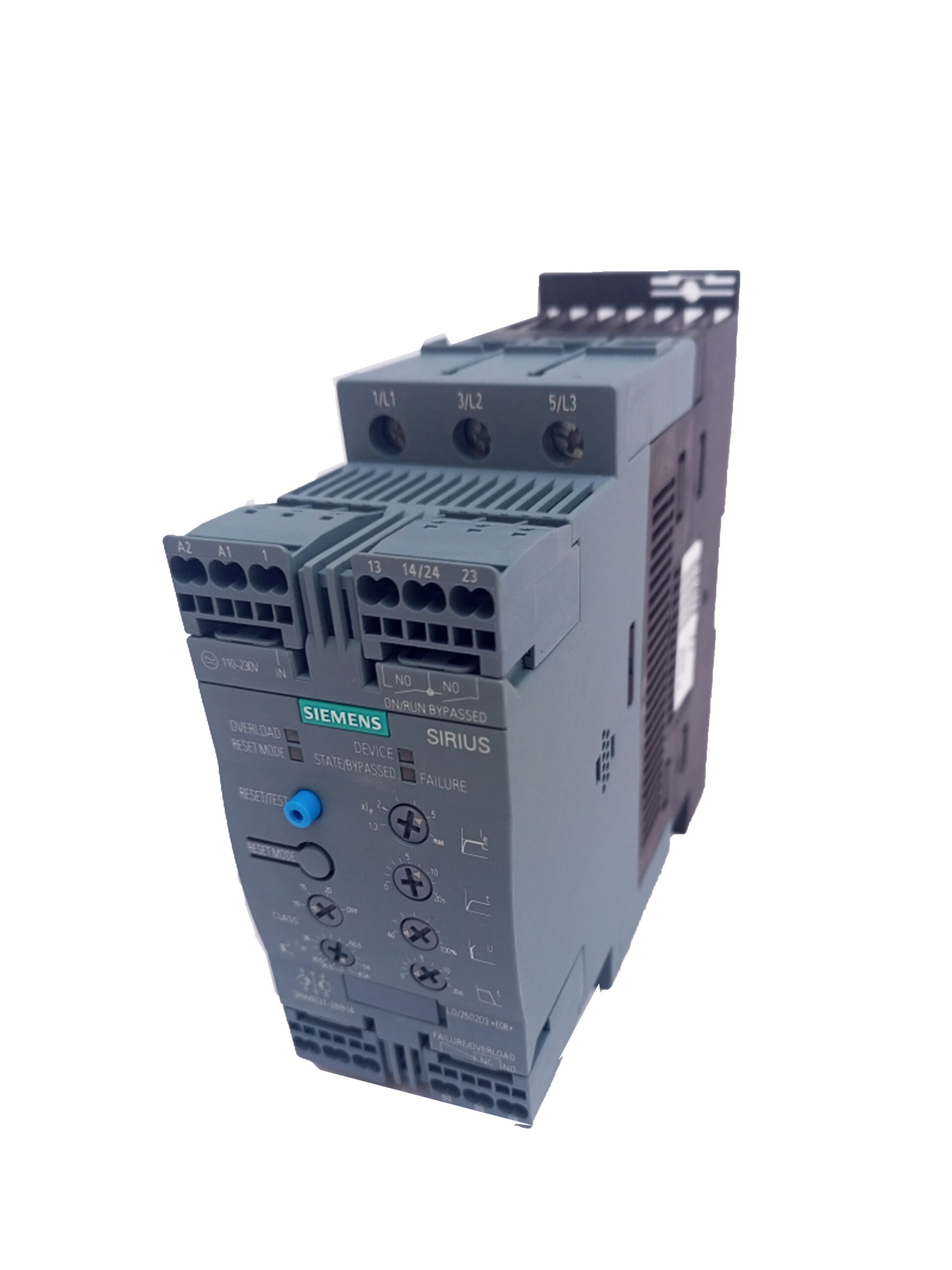 D?marreur progressif Siemens SIRIUS (3RW4028-1BB14) – 38 A, 18,5 kW ? 400 V, con?u pour un d?marrage moteur en douceur. Fonctionne sur 200-480 V CA avec une tension de commande de 110-230 V CA/CC. Bornes ? vis pour des connexions s?curis?es.
