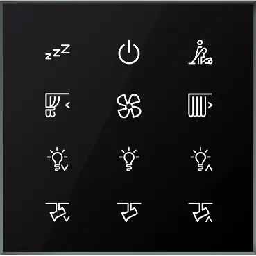 Panneau tactile en verre SpaceLogic LSSMBU12NP de Schneider Electric, Modbus, 12 boutons tactiles configurables. Idéal pour les applications en chambres d’hôtel, notamment l’éclairage, le chauffage, la ventilation et la gestion de l’énergie, avec un design élégant et moderne.
