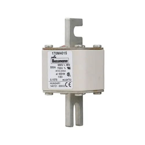Eaton Bussmann 170M4015 High Speed Square Body Fuse, 550 A, 690 V AC (IEC), aR, DIN 43653, blade-to-blade terminals, with top-mounted status indicator.