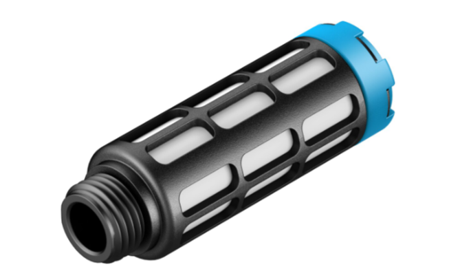 Compact pneumatic silencer with G1/4 connection, designed to reduce exhaust noise to 76 dB(A) while supporting airflow up to 3300 l/min. Suitable for compressed air systems up to 10 bar.