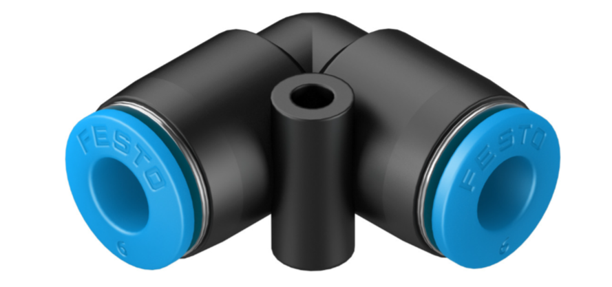 Right-angle push-in connector for 6 mm tubing. Ideal for compact pneumatic systems requiring space-saving 90? directional flow.