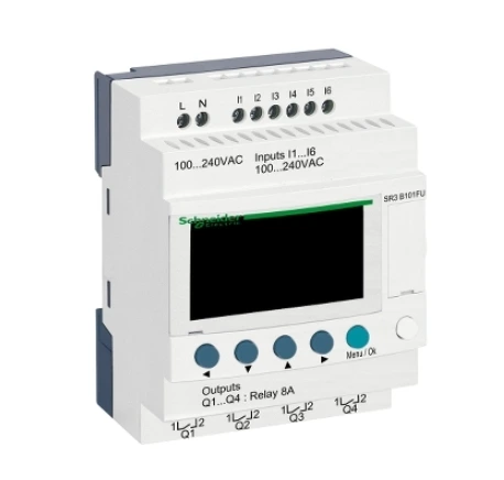 Zelio Logic SR3B101FU smart relay with 10 I/O, built-in display, real-time clock, and 100?240V AC supply. Ideal for compact automation and control tasks.